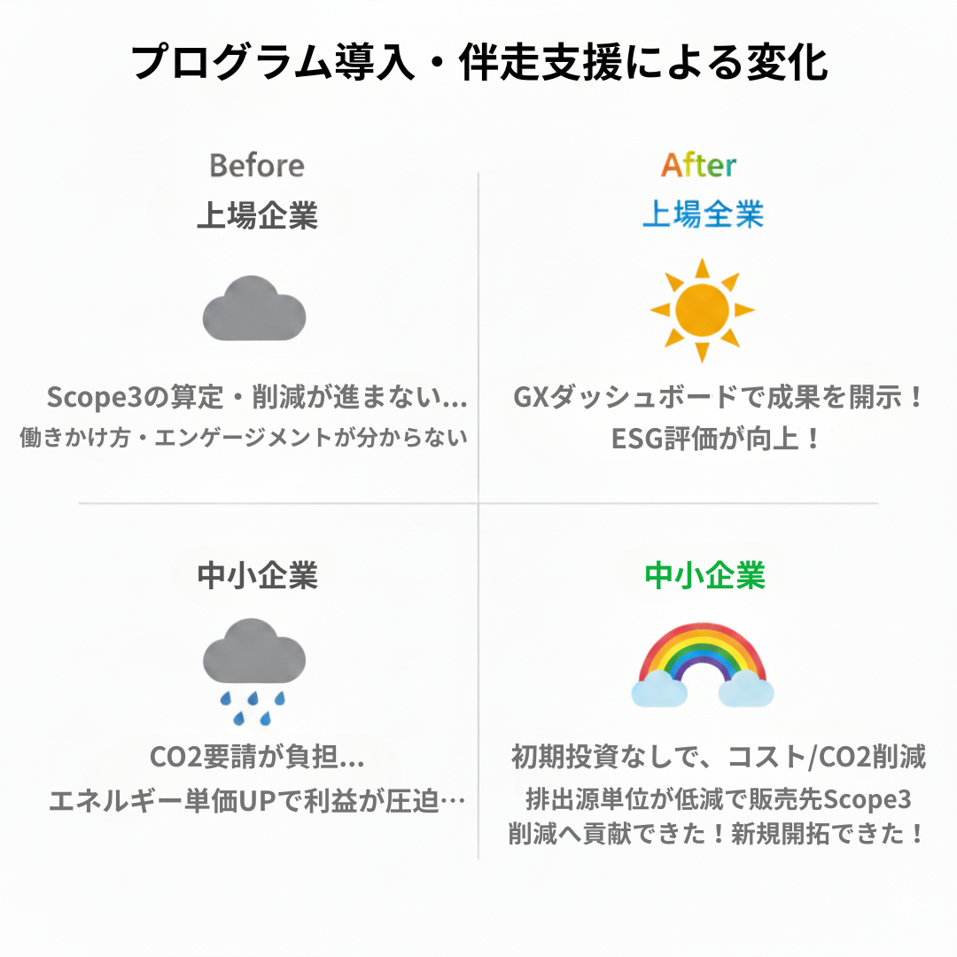 中小企業にとってはコスト削減と競争力強化を、上場企業にとってはScope3削減の実現とESG評価向上を。このイメージ図に描かれている未来こそ、私たちがご提供する具体的な成果です。