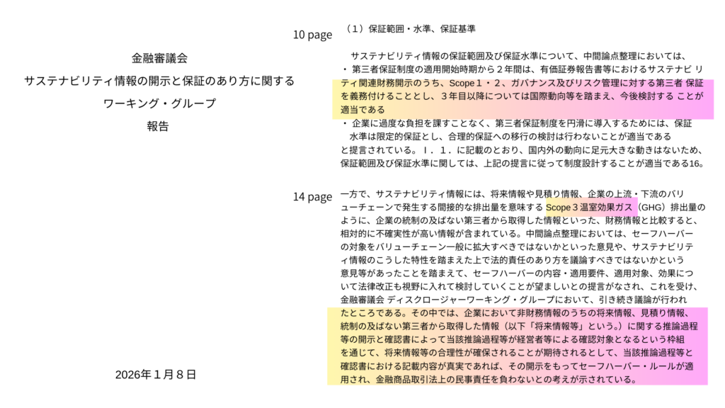 [1] 金融庁:サステナビリティ情報の開示と保証のあり方に関するワーキング・グループ報告書(2026年1月8日公表)