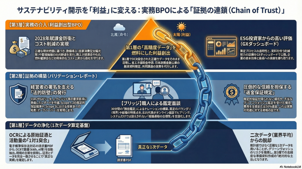 B2Sが提唱する「垂直統合」は、Scope 1・2の監査法人対策と、Scope 3のセーフハーバー獲得対策を一本の線で繋ぐ手法です。データの系譜を整え、検証レポートを整備・公開し、受け身ではなく能動的に「合理性の根拠」を説明する体制を指します。