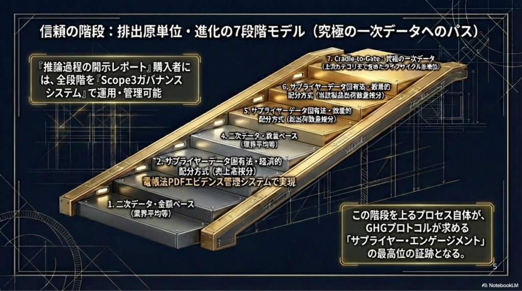 - 土台と1階: 共通のエビデンス管理とバリデーション。ここで「事実」を固定し、炭素生産性のポテンシャルを特定。