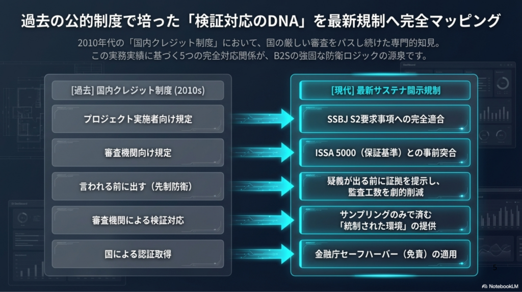 当社代表がかつて全国中小企業団体中央会の「国内クレジット制度(現J-クレジット)」の専門員として培った、ドキュメンテーション技術、および、認証機関の厳しい検証に際し、「指摘される前に出す」という監査工数最適化スキルを提供します。検証側の思考を先読みし、疑義が生じる前に証拠を提示する「先制防衛」の姿勢こそが、当社のDNAです,。
